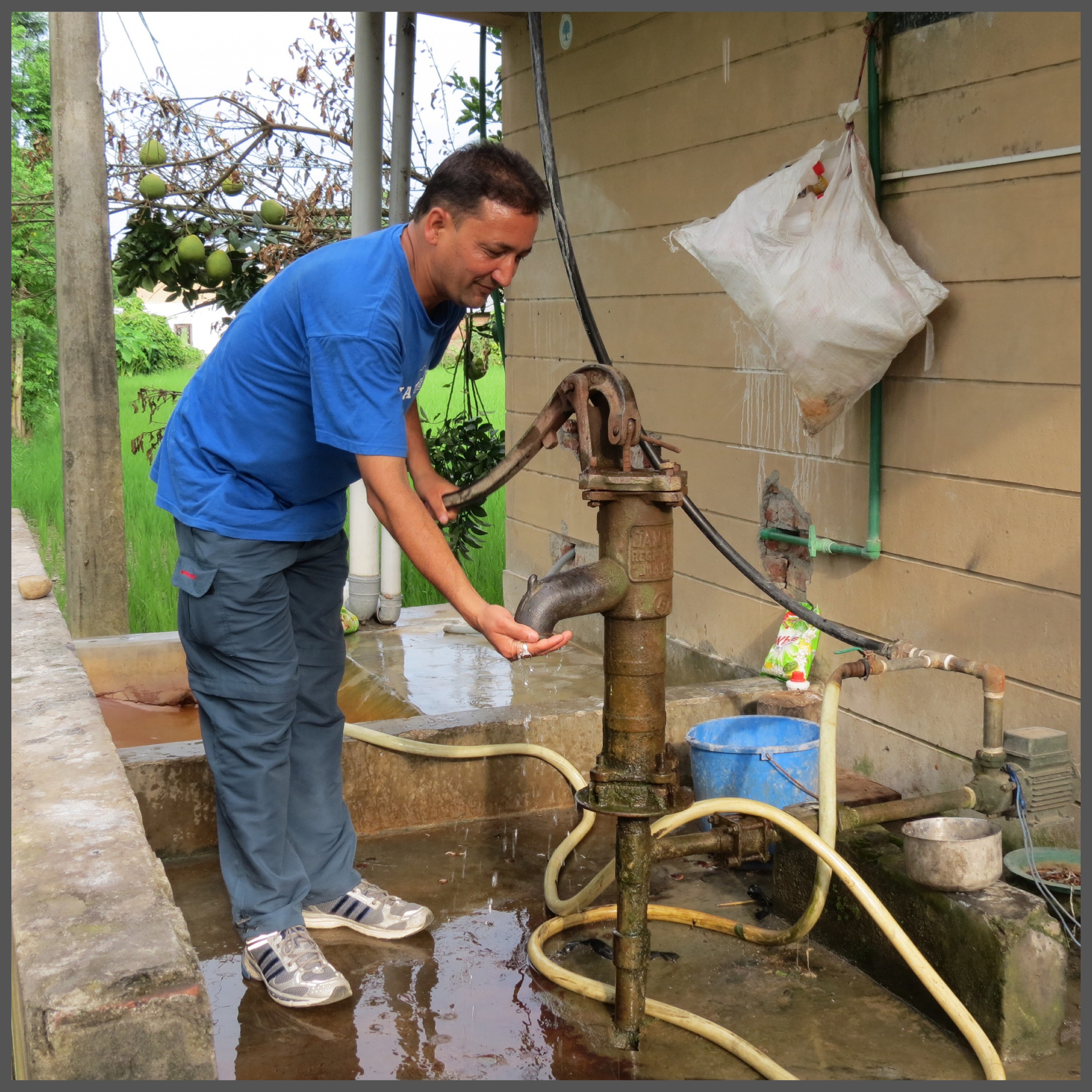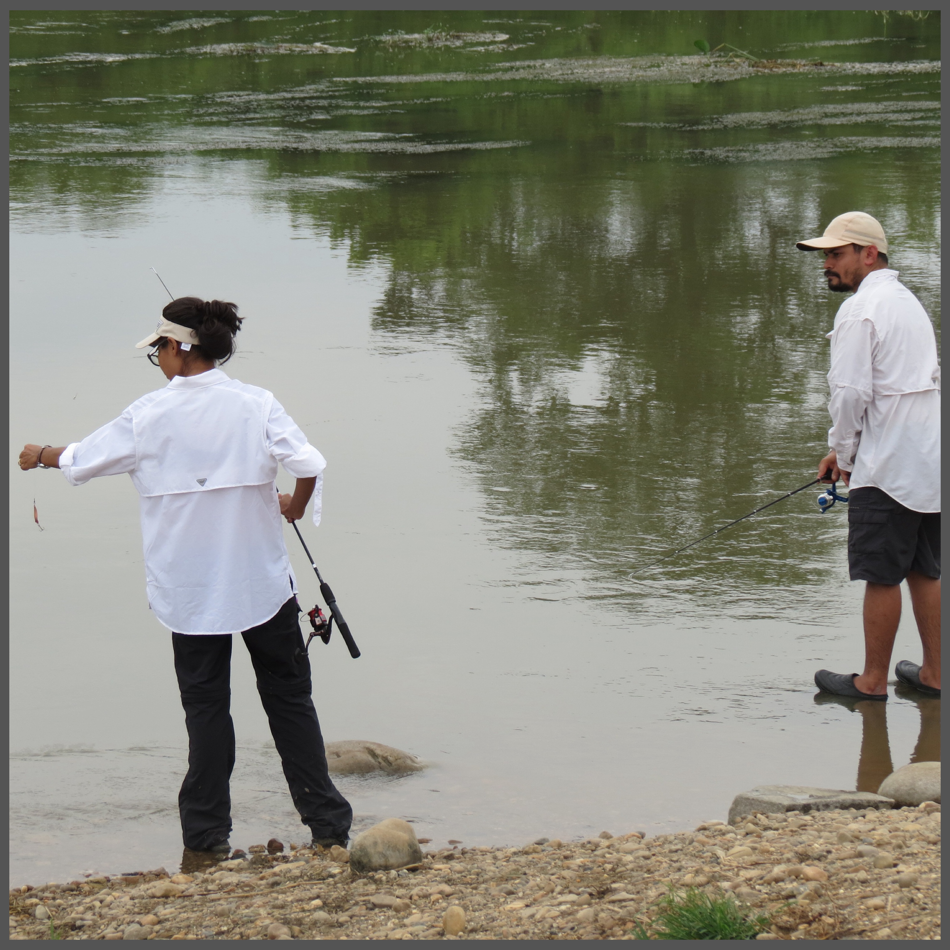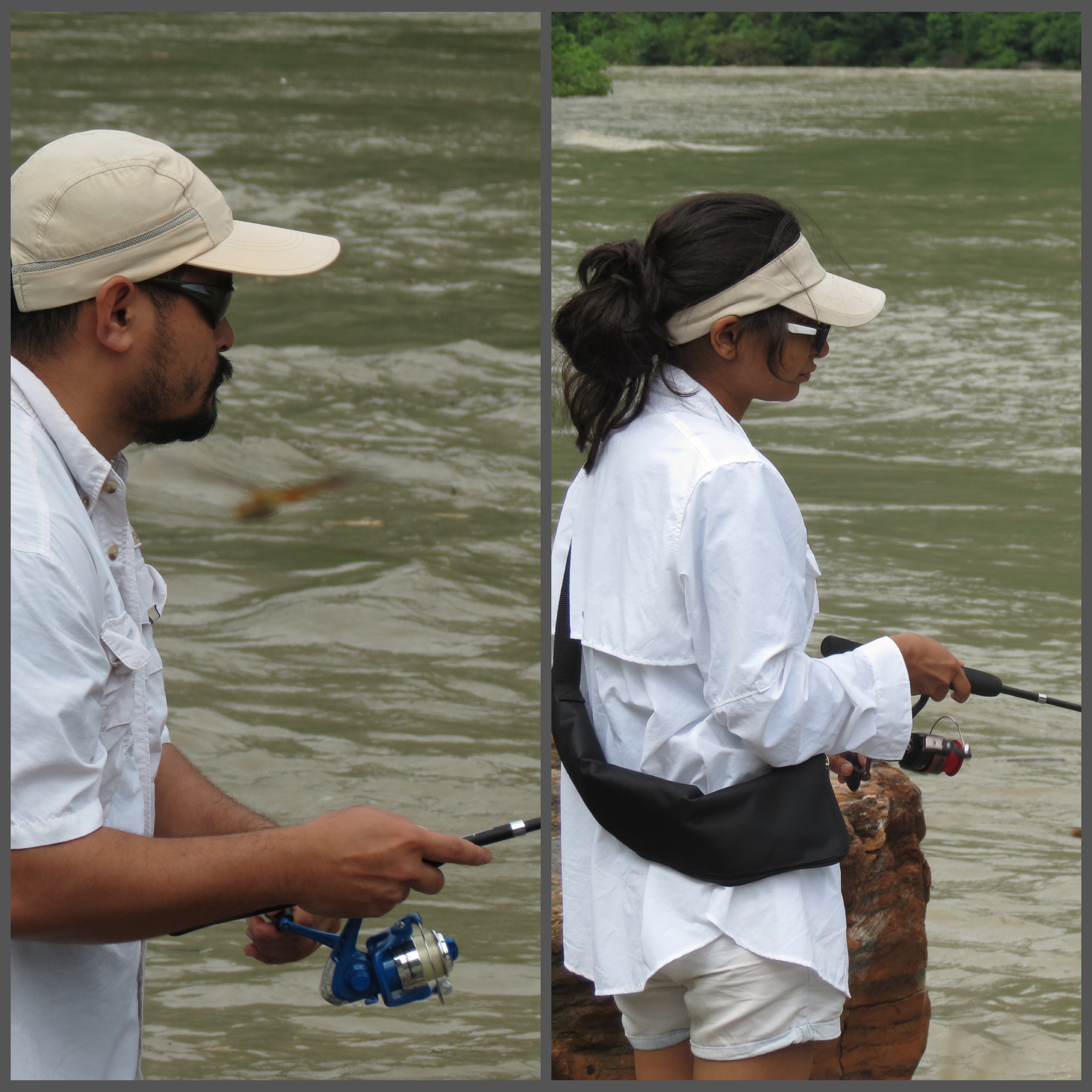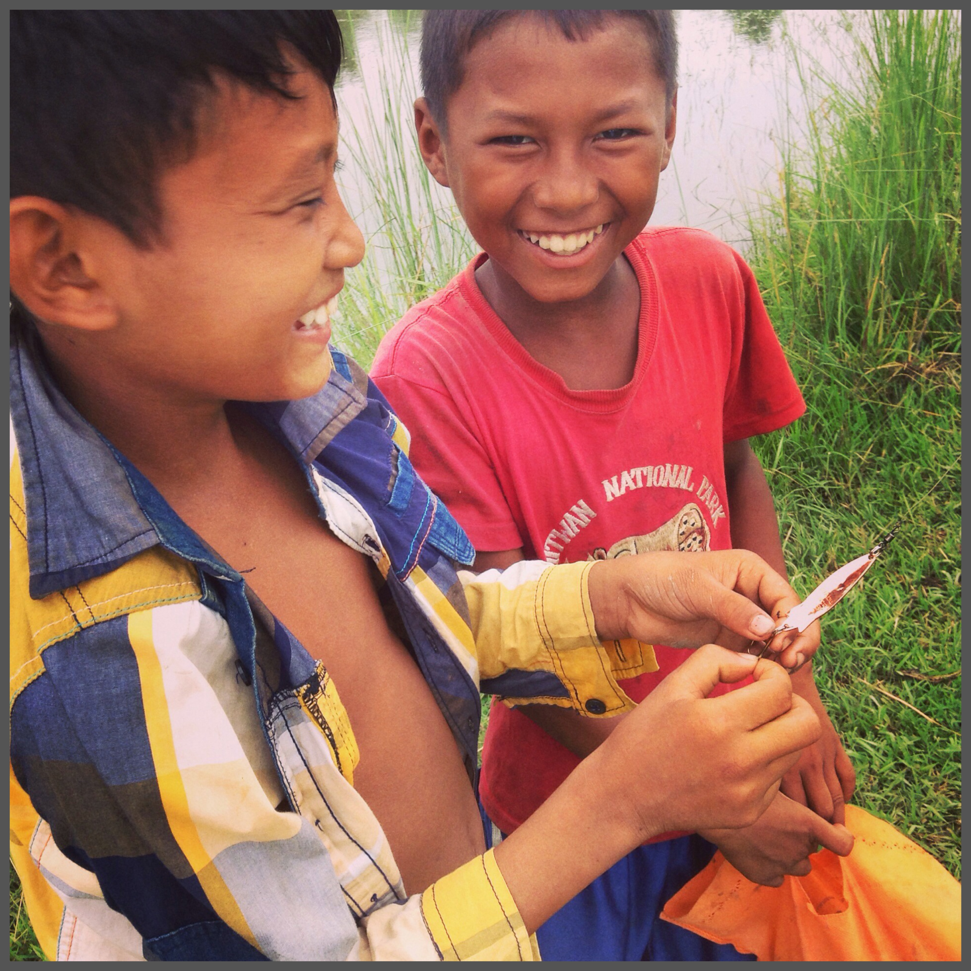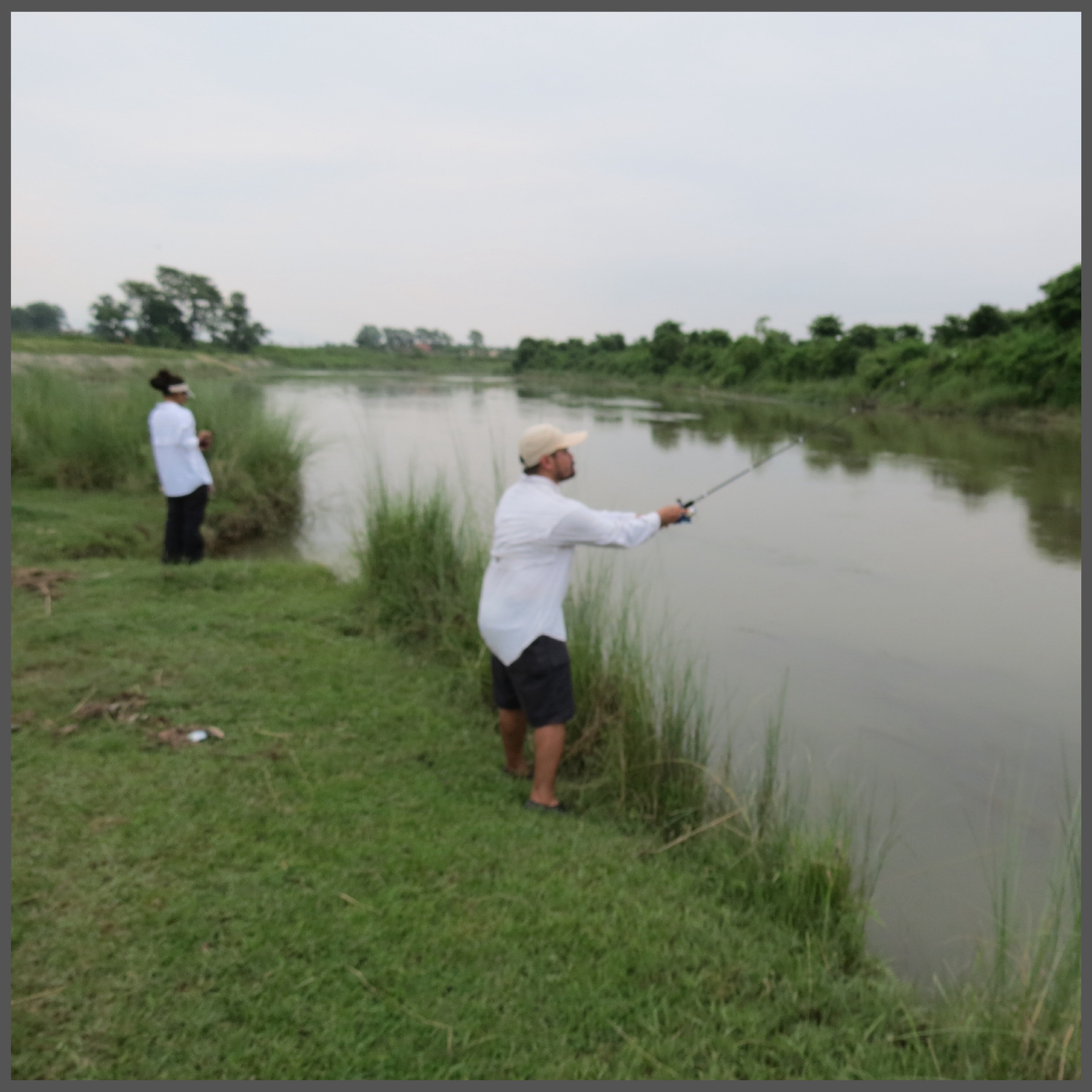Bhaskar and Saroj brought us to a nearby village where the Rapti River was open for fishing, laundry, showers and just about anything that rivers could be used for. News of our arrival attracted two young boys, who fished in the area, standing on higher ground as spectators to us fishing. With lures and spoons, we begin our attempt, walking into the river, settling knee deep casting our lines with hopes to land a fish, of any species. With a lot of growth underneath, we kept getting tangled with weeds and greens. The boys came down into the river, assisting us when our lines got stuck once in awhile, they were in awe of our tackle, our rods and mostly, our hooks. We had red coloured Mustad fishing hooks with us, coloured hooks was something they have never seen before. Looking through our tackle box, they were astounded by our grub collection. We continued on, changing locations with the boys following us… They were told not to impose on our fishing attempts but stayed around close enough to build a friendship. On our last few attempts, the boys went back up on higher ground to watch us fish. Suddenly, I heard a familiar word.
